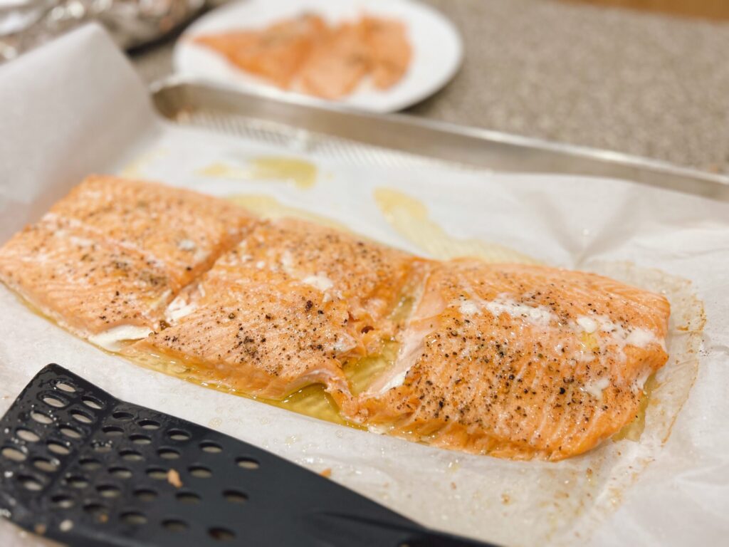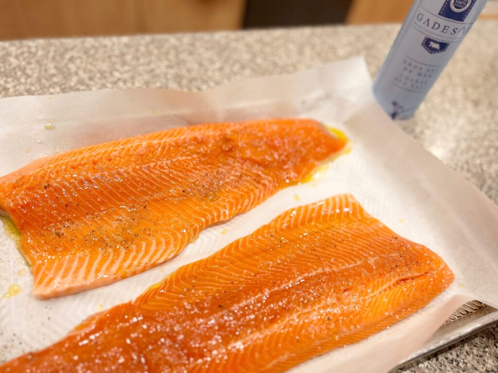 サーモンの半身を、皮を下にして置きます。